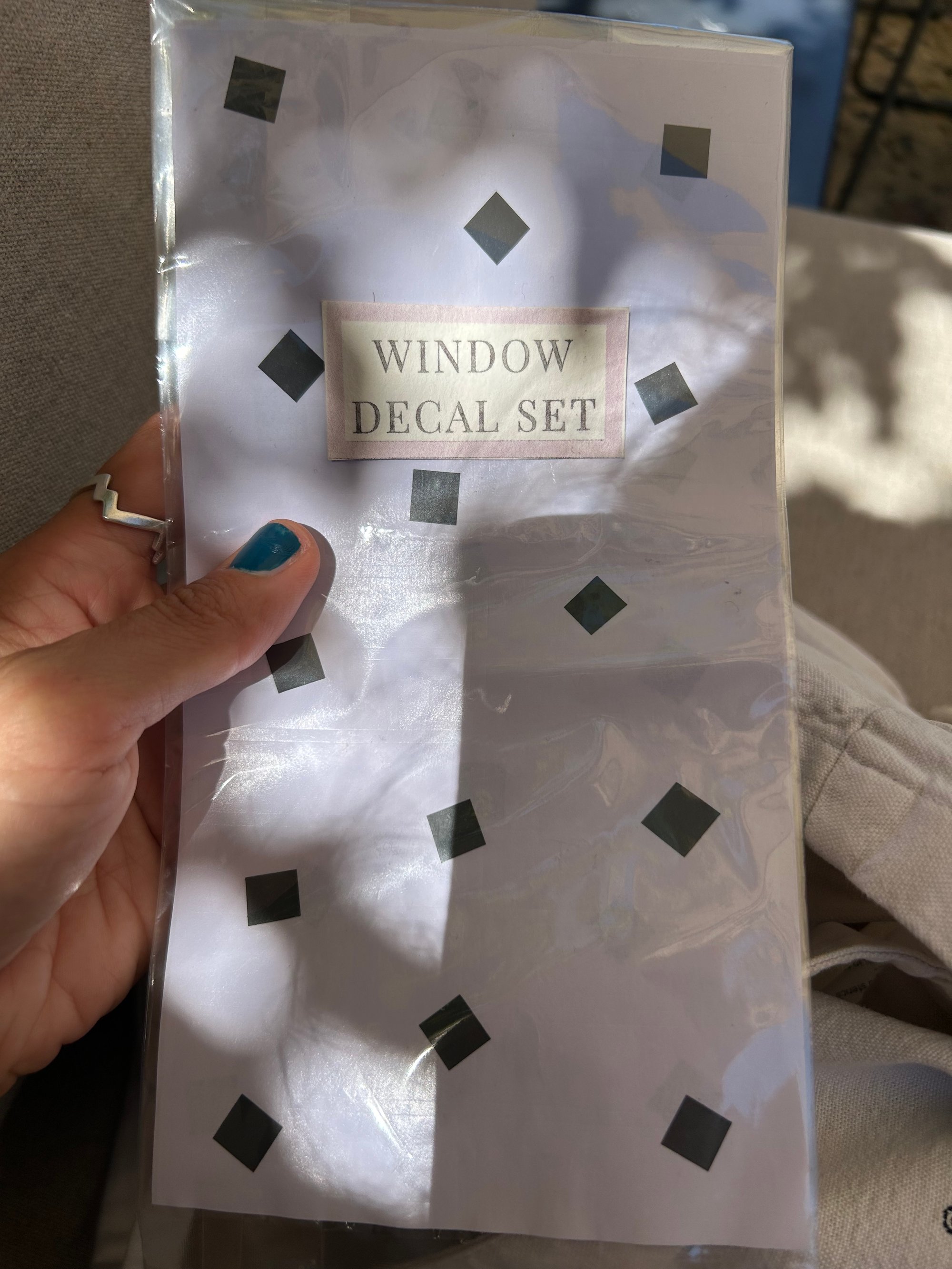 Contents: Each kit includes two sheets of muted black square decals, each approximately 1/2 inch in size, totaling around 22. This quantity is sufficient to cover a medium-to-large window with 4–6 inch spacing between each square. Shapes are hand cut; exact shapes may vary slightly.